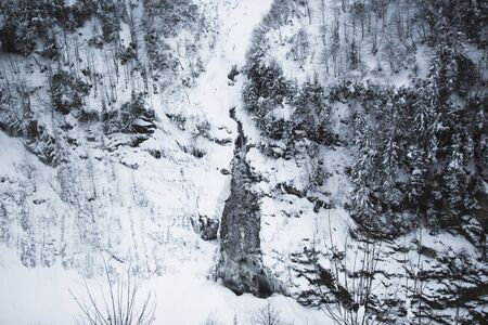 Shirahige Waterfall with Snow in winter, Biei river flow into Blue Pond. landmark and popular for attractions in Hokkaido, Japan. Travel and Vacation concept