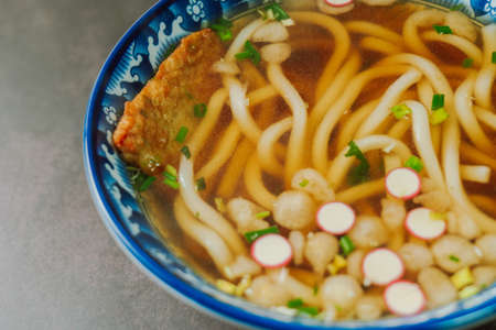 Myanmar traditional or classic white rice noodle fish soup called mohinga