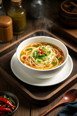A steaming bowl of noodle soup garnished with fresh coriander leaves and red chili peppers, capturing the essence of comfort and flavor in every bite.
