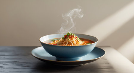 AI Generated. Warm steaming bowl of delicious noodle soup with toppings served in an elegant blue bowl on a dark wooden table