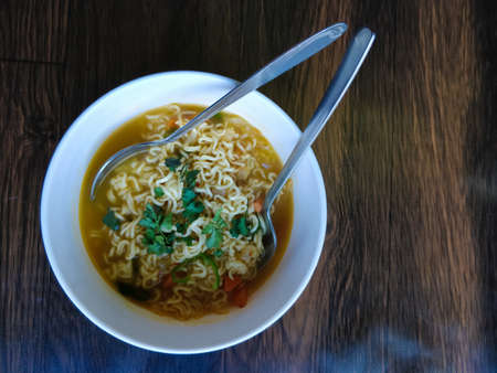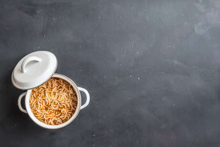 Instant pasta, Japanese and Chinese noodles. Ramen type soup in a plate with chopsticks, junk fast food. Quick-cooking pasta