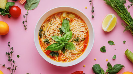 A vibrant bowl of Asian inspired noodle soup featuring fresh herbs, spices, and citrus elements arranged beautifully against colorful backgrounds.