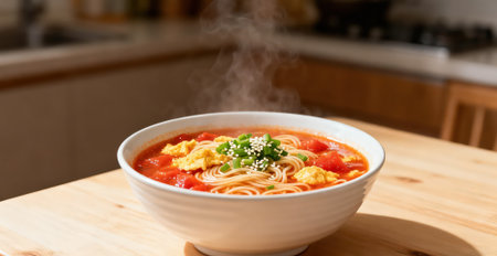 AI Generated. Steaming bowl of ramen with fresh vegetables and crispy toppings served in a cozy setting