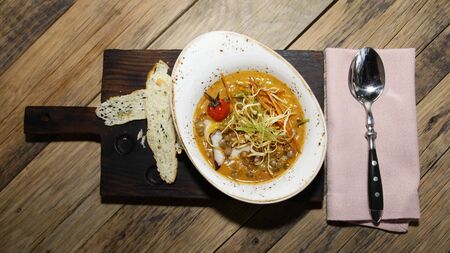 pumpkin soup with meat and vegetables in a plate on a wooden table