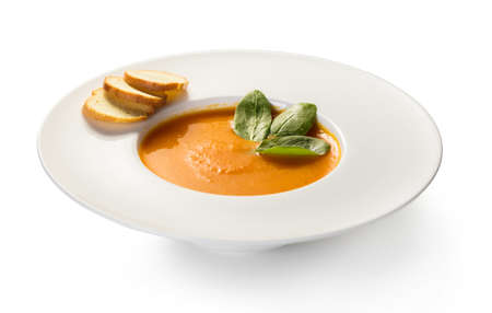 Delicious tomato soup with fresh basil and toasted bread