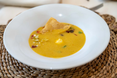 delicious yellow corn soup with various combination of tortilla chip, veggies, flowers, and cheese in the bowl at high end restaurant