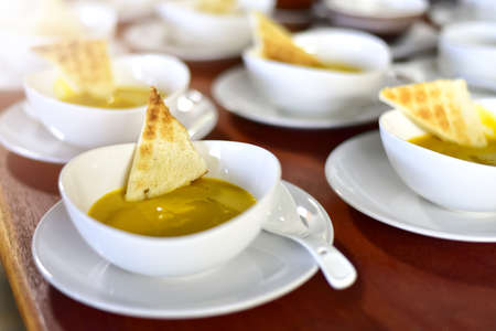 Small snack - gazpacho soup served in coffee cup with whipped cream