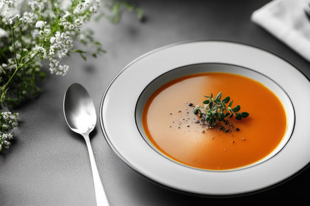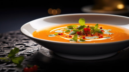 A bowl of soup with garnish on a table, AI