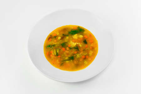 Vegetable soup in a plate on a white background. The view from the top