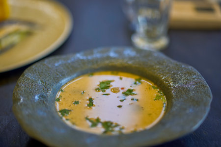 a plate of fish soup (sorceag) on ​​a table