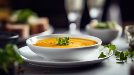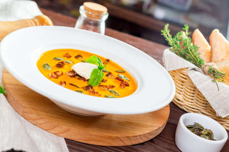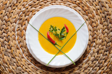 pumpkin soup in white bowl - Vegetarian and vegan food style