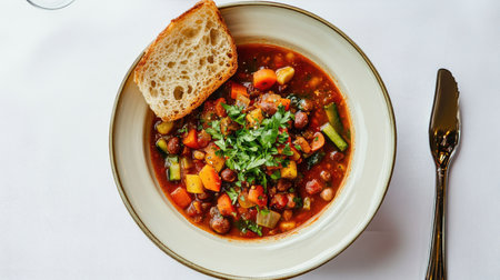 A hearty bowl of minestrone soup brimming with fresh vegetables and beans, paired with a slice of rustic bread, perfect for any comforting meal.