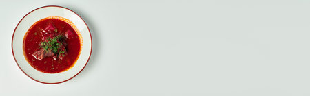 traditional food banner, traditional Ukrainian borsch with beef in ceramic bowl on grey backdrop