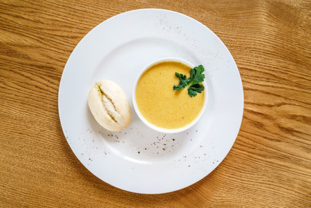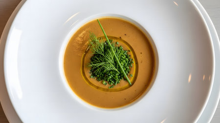 Pumpkin soup with dill and parsley on a white plate
