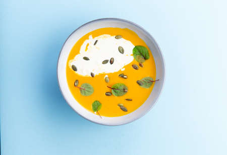 Pumpkin soup in a bowl on a blue background. selective focus.
