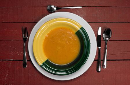 plate of pumpkin soup on a red wooden table