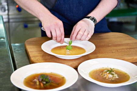 Preparing dishes - vegetable soup on the restaurant kitchen