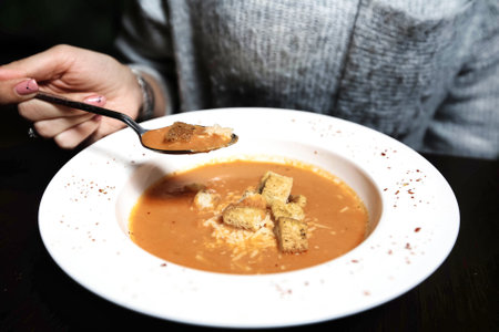 Vegetarian food. Soup puree in a bowl on the table. Woman eating mashed vegetable soup