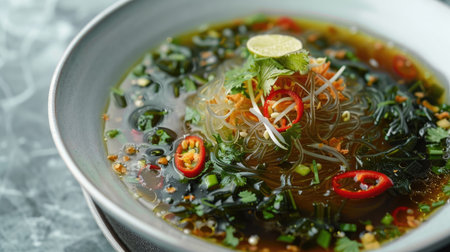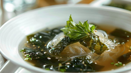 Elegant presentation of Thai seaweed soup with glass noodles in a white dish