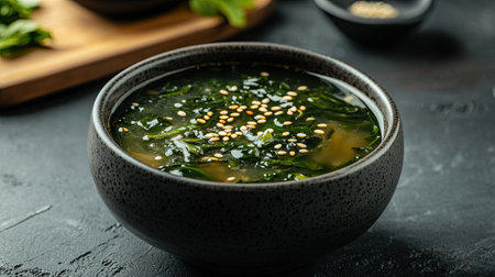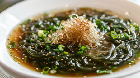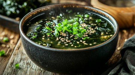 A vibrant bowl of fresh seaweed soup garnished with green onions and sesame seeds, showcasing rich textures and healthy ingredients, perfect for a warming meal.