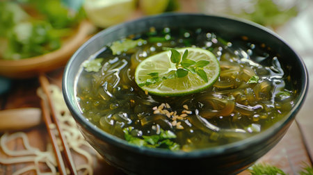 Freshly made Thai clear seaweed soup with glass noodles and lime slices