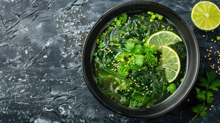 This image features a rustic bowl of fresh seaweed soup, showcasing vibrant green ingredients in a warm setting, ideal for health-conscious cuisine.