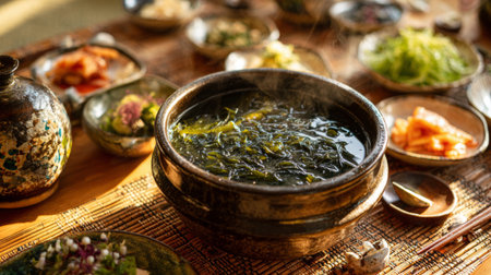 A steaming bowl of seaweed soup surrounded by a selection of vibrant side dishes, presenting a warm and inviting traditional meal experience perfect for culinary enthusiasts.