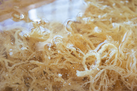 Sea bird nest or Eucheuma Cottonii Seaweed being cleaned with water inside a container. It is used as traditional chinese medicine to improve joint collagen and remove toxin.