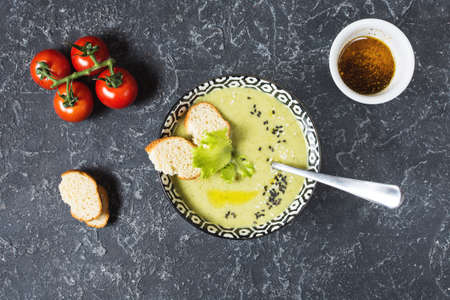 Healthy detox broccoli green cream soup in a bowl on black stone table. Top view