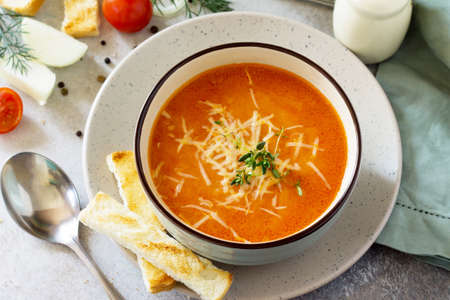 Puree soup tomato with croutons and cheese in a bowl on a light slate background. The concept of healthy eating. Diet menu.
