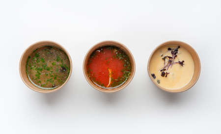 Healthy meal, food delivery and soups assortments. First courses, new menu and modern eat with greens and baby spinach in paper cups, isolated on white background