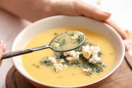 Vegetarian food. Soup puree in a bowl on the table. Woman eating mashed vegetable soup