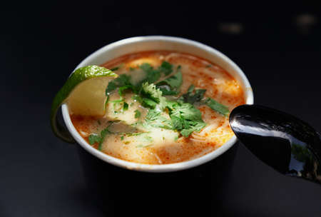 Thai or Vietnamese cuisine: Tom Yum Goong spicy and sour soup with noodles on black background. Spoon and bowl with noodle soup with seafood. High quality image
