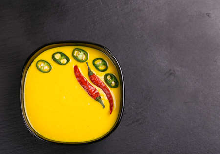 Traditional Indian cuisine. Vegetarian curry Gujarati Kadhi with chickpea gravy and sour yogurt. Copyspace, top view, flatlay