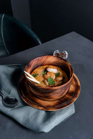 Thai tom yum soup, Thai soup with Shrimp, coconut milk and curry.