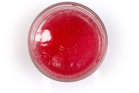 Glass of water with dissolved in it effervescent tablet of pharmaceutical product, top view close-up on the light surface