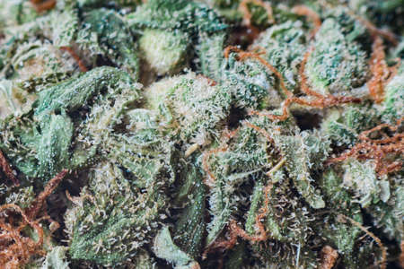 Macro photo of hemp inflorescence tips, thc crystals on cannabis shoots. Marijuana macro photo.