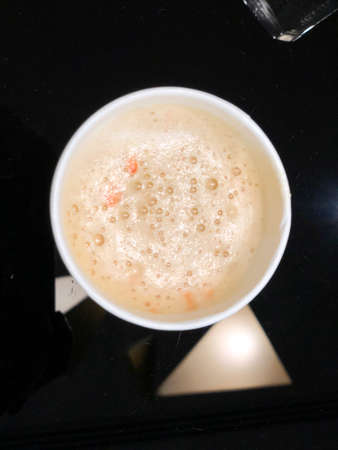 Coffee. White foamy coffee top view on a natural pine table. Breakfast.