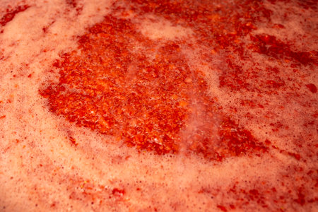 Boiling strawberry jam with steam and bubbles, soft focus side view