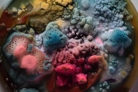 Colorful fuzzy mold texture with glitter and contrast shapes captured in a unique display