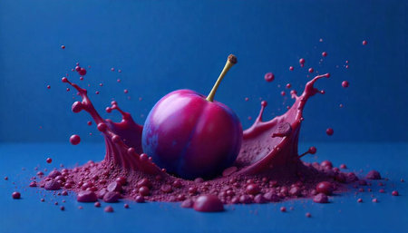 A close-up shot of vibrant, juicy red plums artfully arranged in a decorative bowl, with rustic elements in the background.