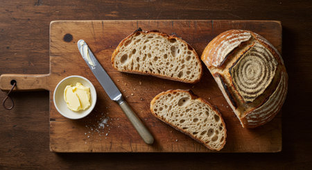 Overhead shot of sliced sourdough bread, butter in a small bowl, and a butter knife on a weathered wooden cutting board, creating a rustic, appetizing food still life.