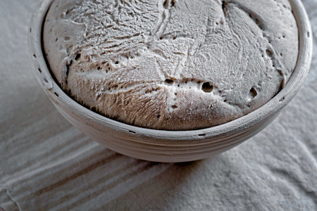 Close-up of a rising sourdough in a rattan basket
