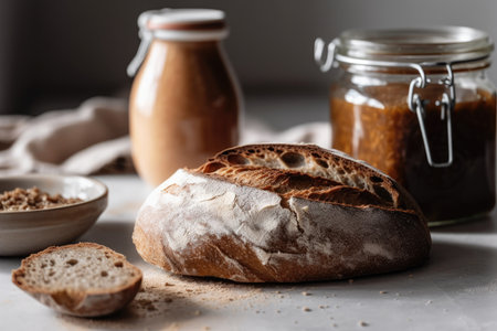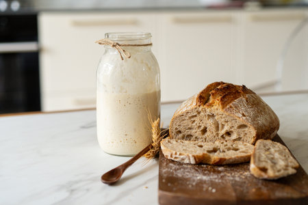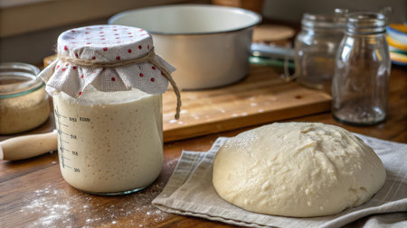 Rustic sourdough starter jar on wooden kitchen table with fresh bread and rolling pin. That the image is generated using AI.