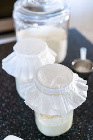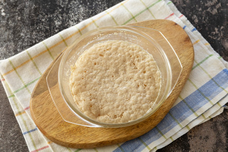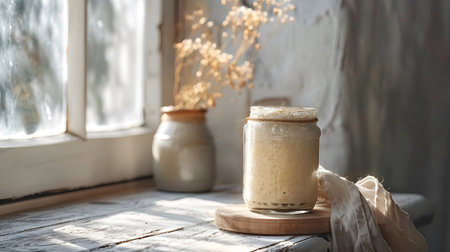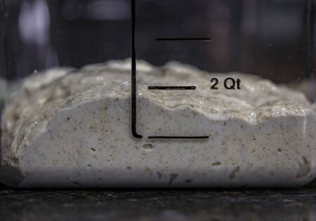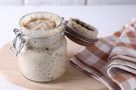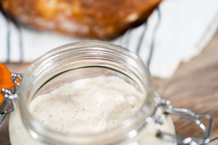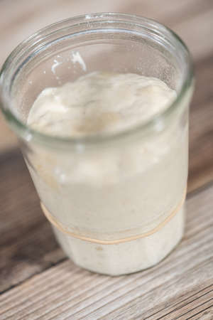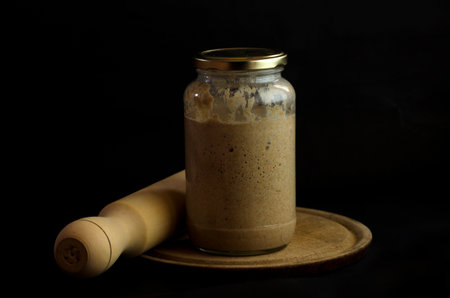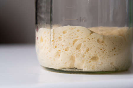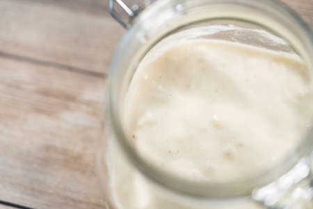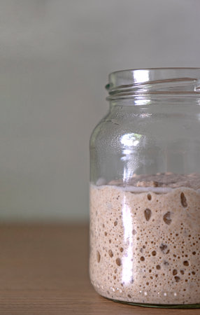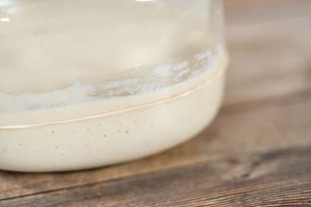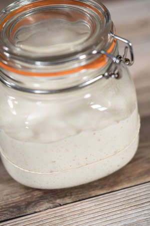 Close-up of pâte fermentée or old dough in mason jar, ready for leavening bread dough