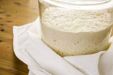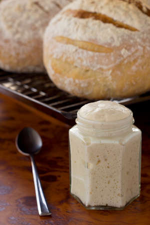 Sourdough starter fermenting and starts to ripen. Sourdough bread in background. Non Sharpen