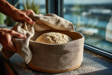 Hands preparing sourdough bread in proofing basket before baking