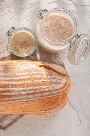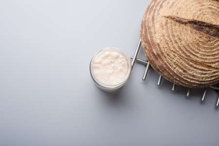 Top view of sourdough starter yeast in a glass jar and freshly baked wholewheat bread over grey background.
