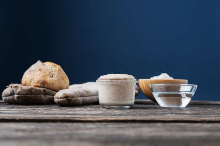 Still life with sourdough starter yeast, freshly baked bread bun on kitchen mitten and cups of water and flour placed on rustic wooden desk. Over blue background with copy space.
