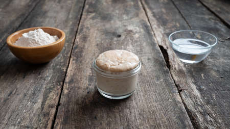 Sourdough starter yeast in a jar next to cup of water and flour - homemade bread ingredients ready to use.